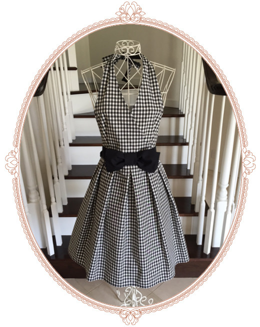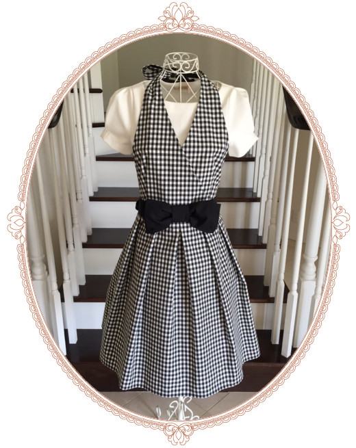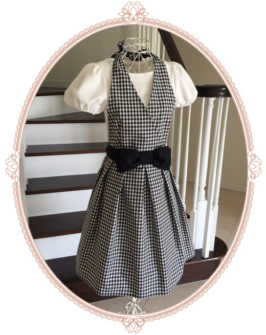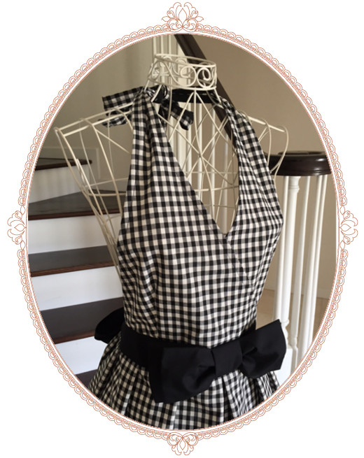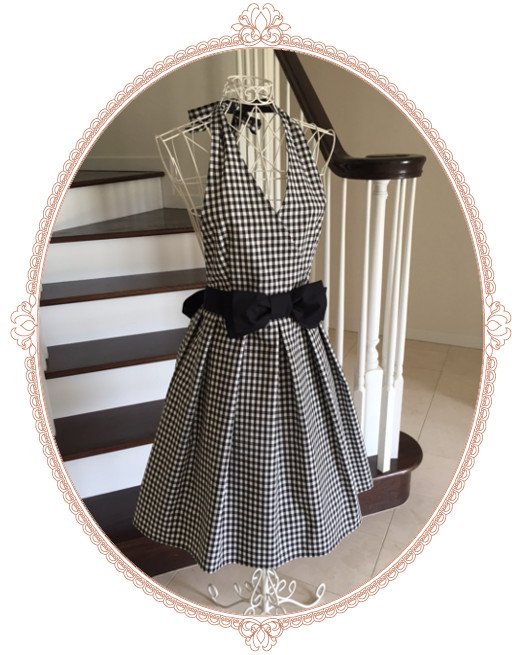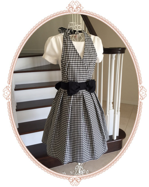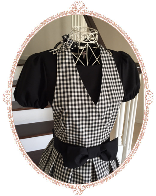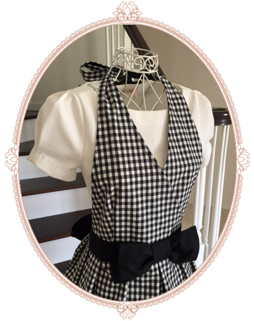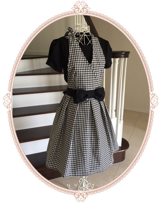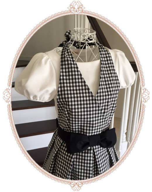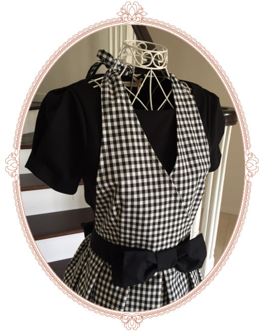カシュクールbigリボンふんわりエプロン 黒白チェックセンターリボン