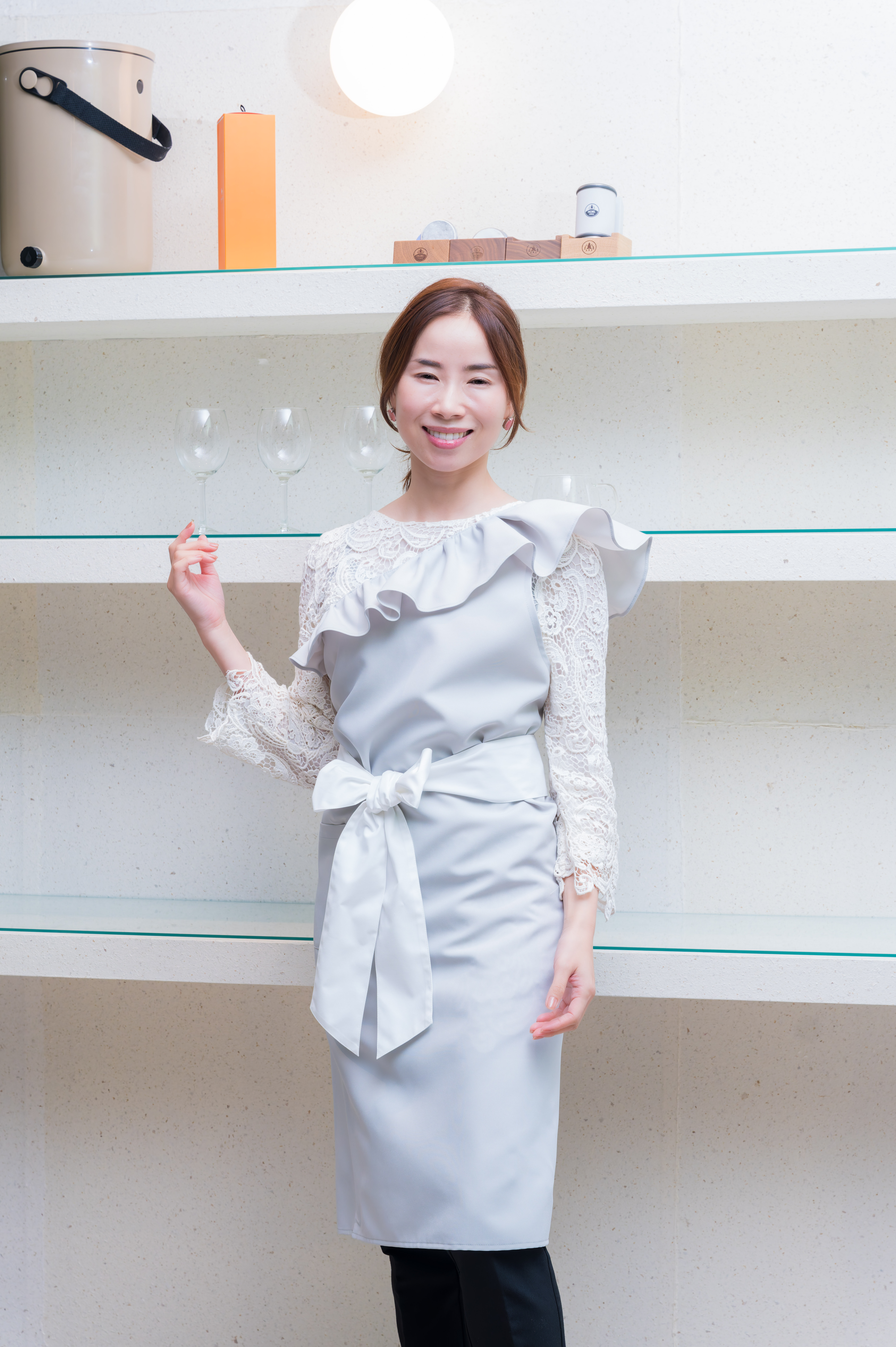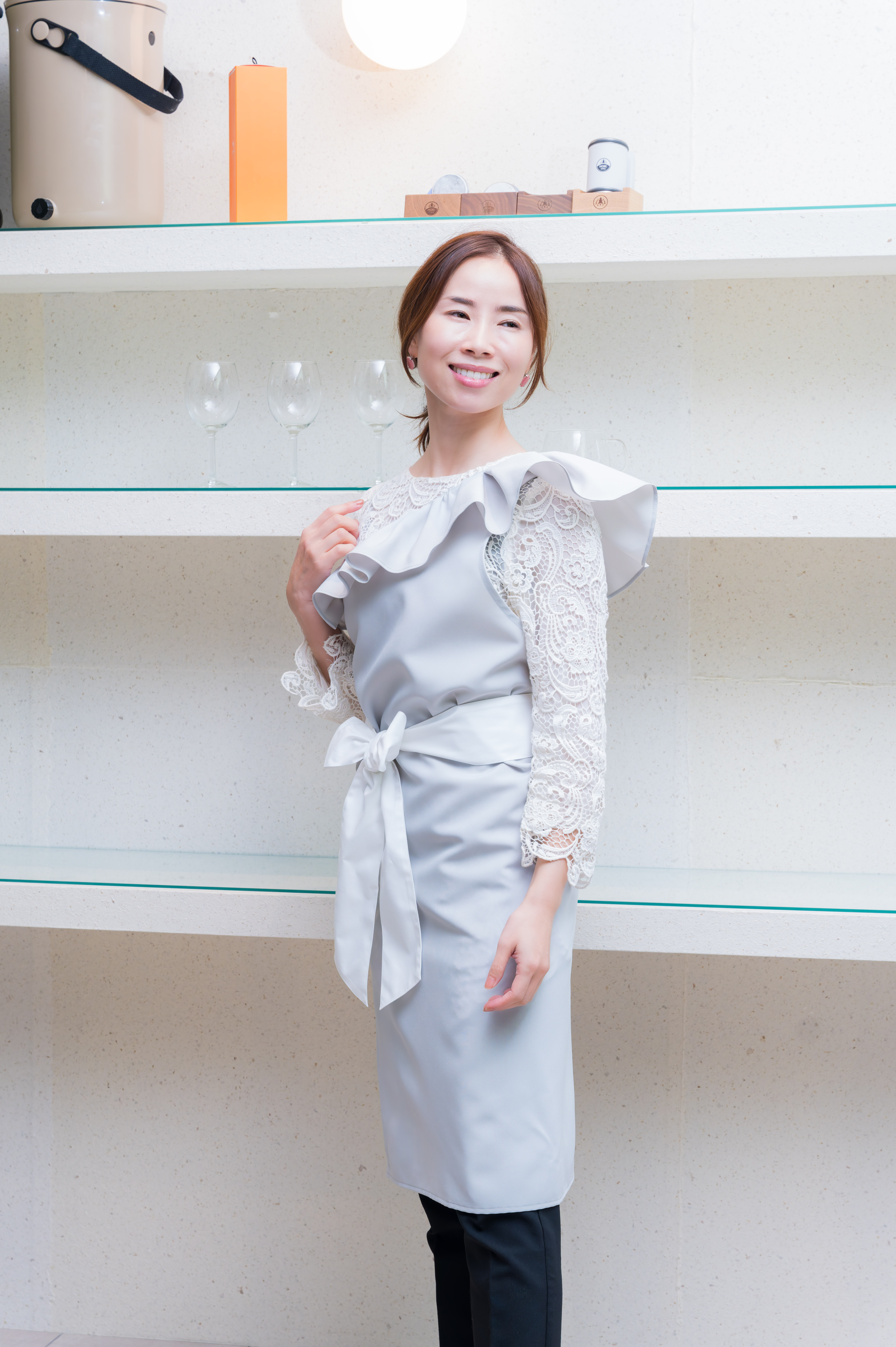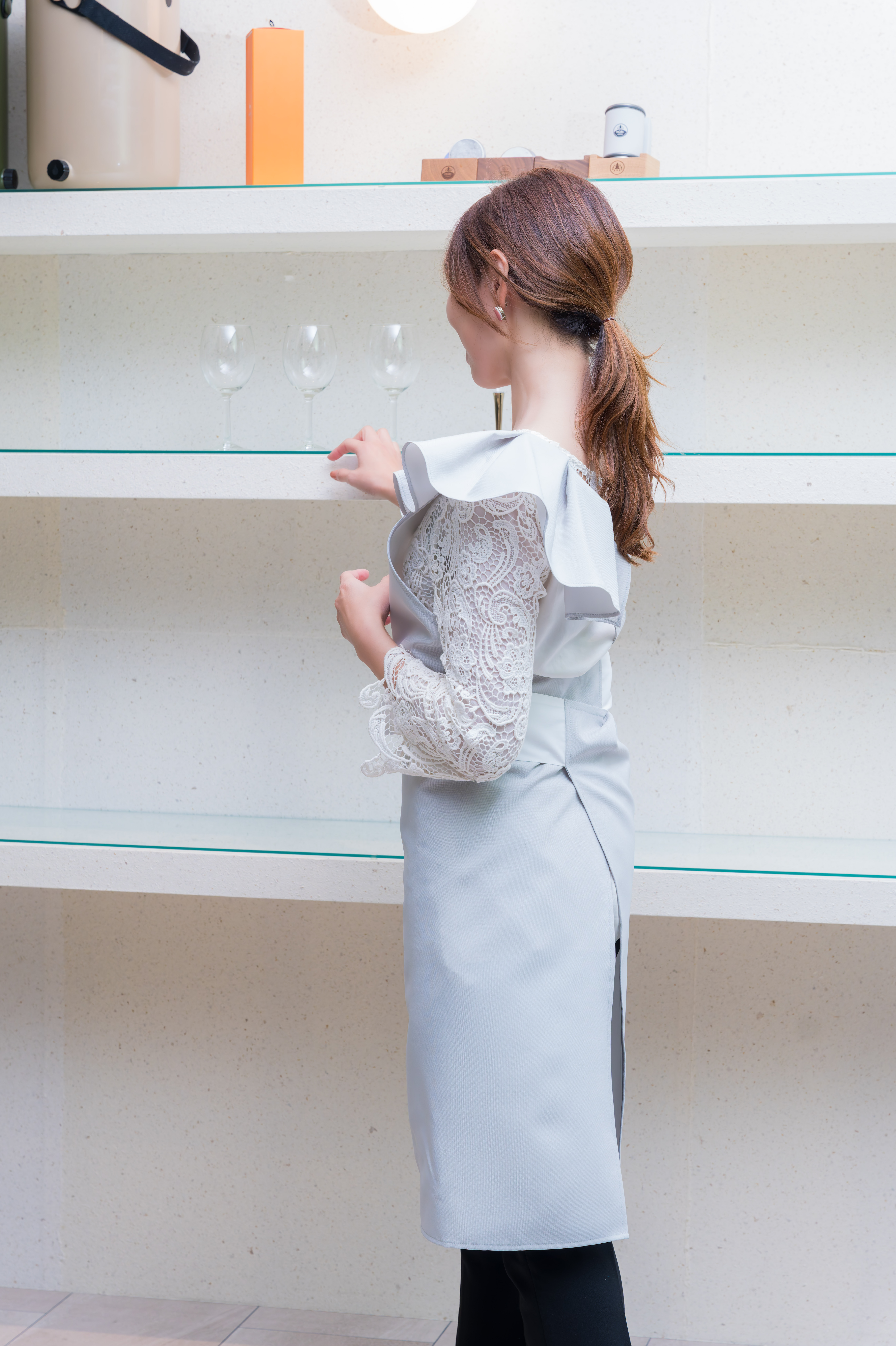 片翼のバックスタイルまるでこれから素敵な世界に飛び立つような羽を広げたようなバックスタイルで 360°美しいエプロンを作り上げている。 |
