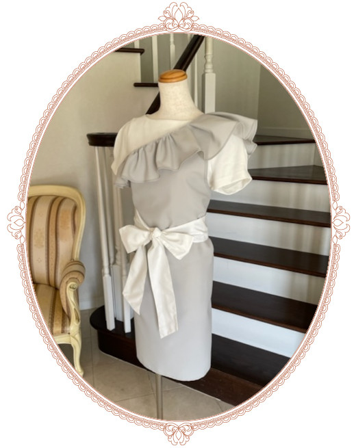 ドレープ感あるゴージャスな肩フリルカーブ、幅の広さ、ギャザーとタックの組み合わせを駆使して 作り上げたドレープ感がゴージャスな肩フリルを作り上げています。 |