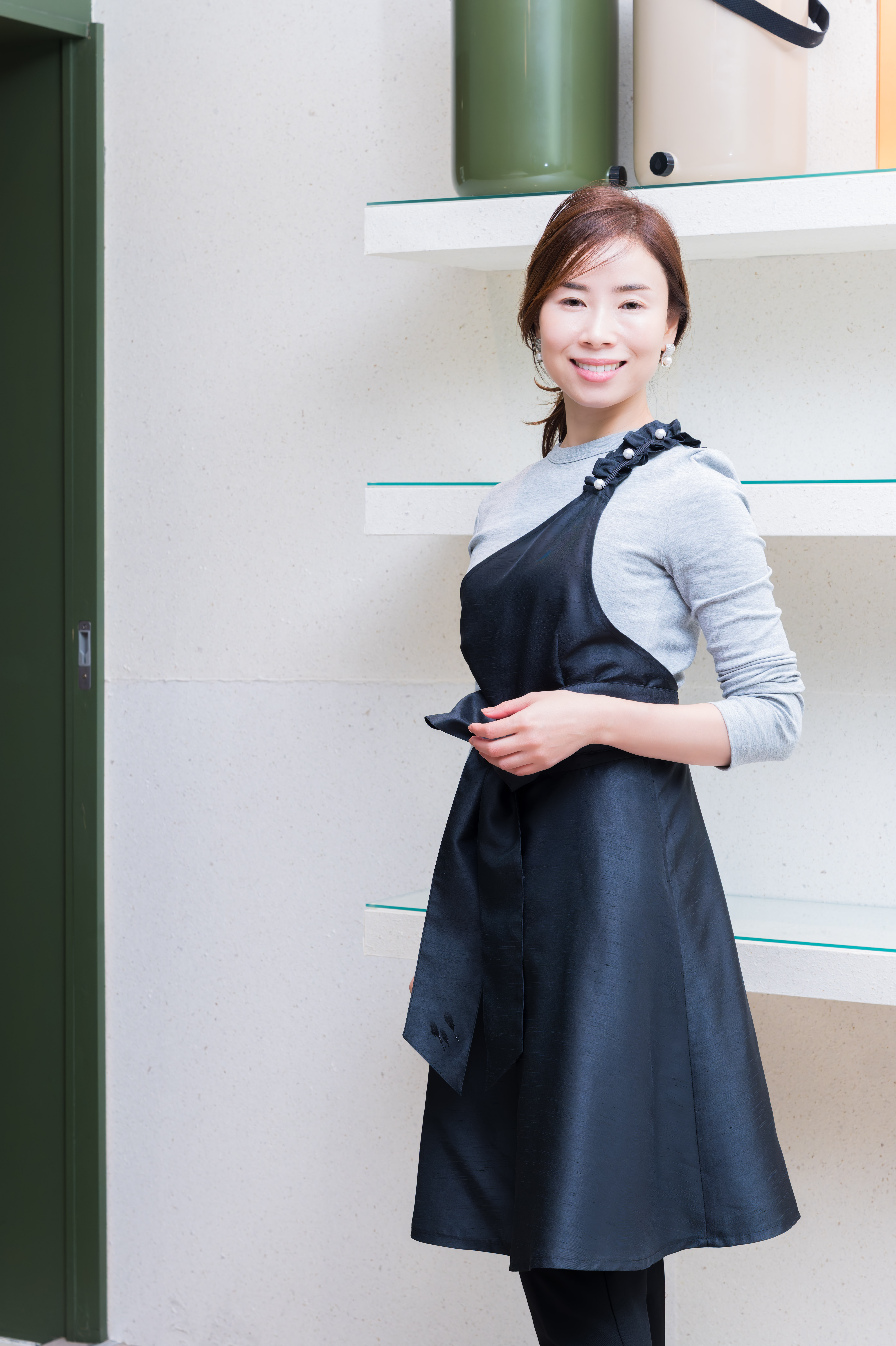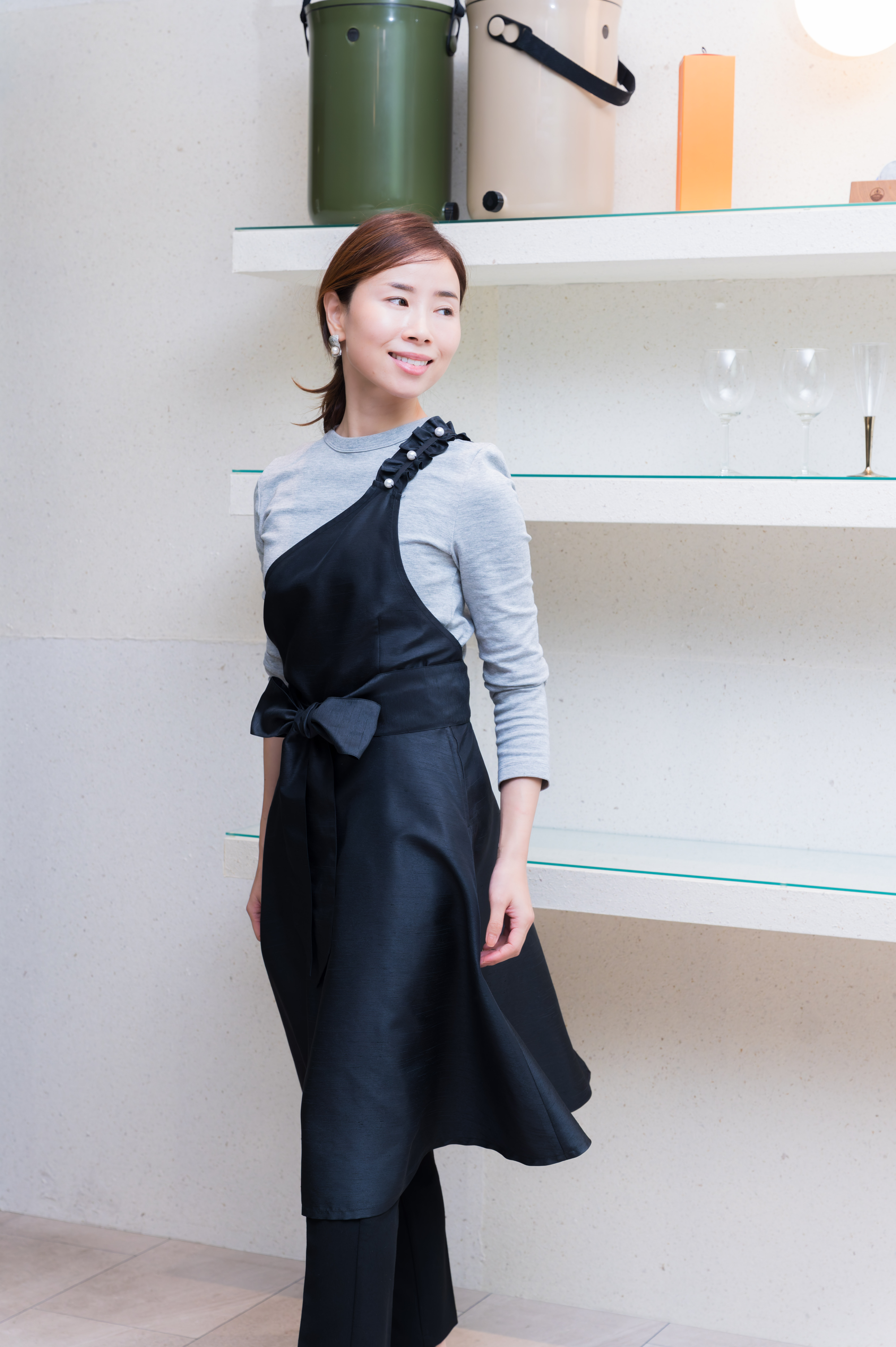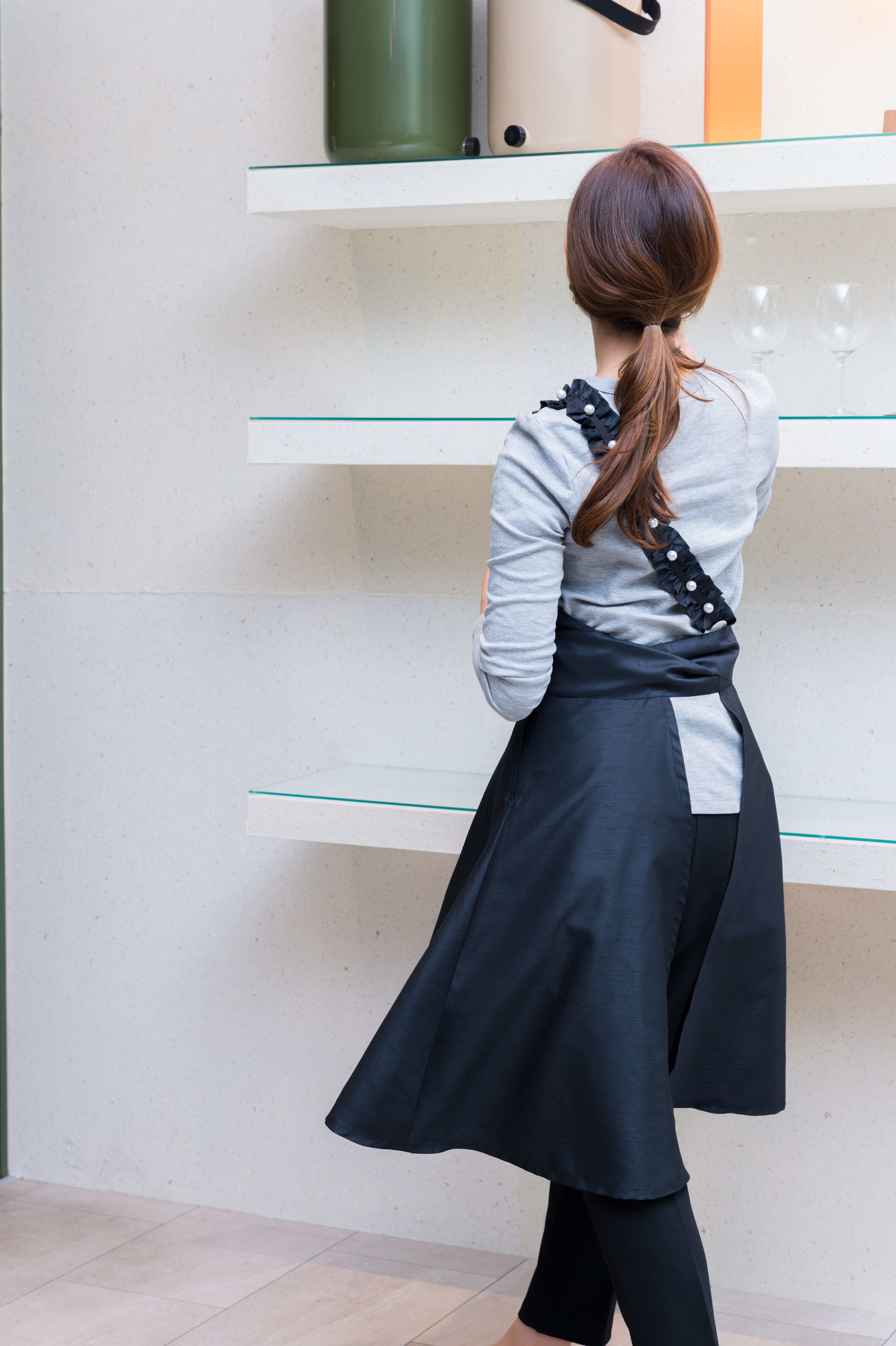 肩ひもフリルパールエプロン(フレアー) シャンタンブラック