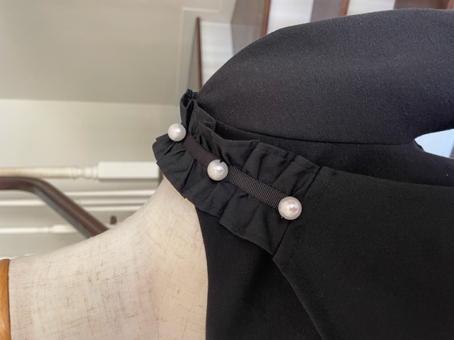 主役級の Shoulder Strapフリルを肩紐に。ギャザーの糸が切れないよう、アクセントになるグログランリボンと白く煌めくパールで仕上げた、可憐ながら主役級の肩紐です。 |