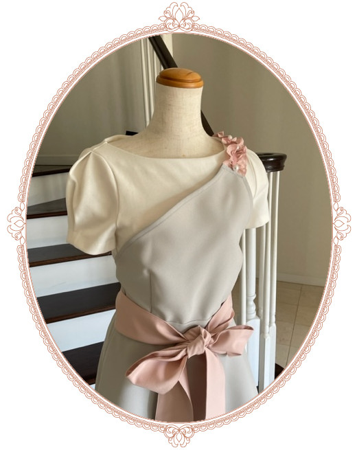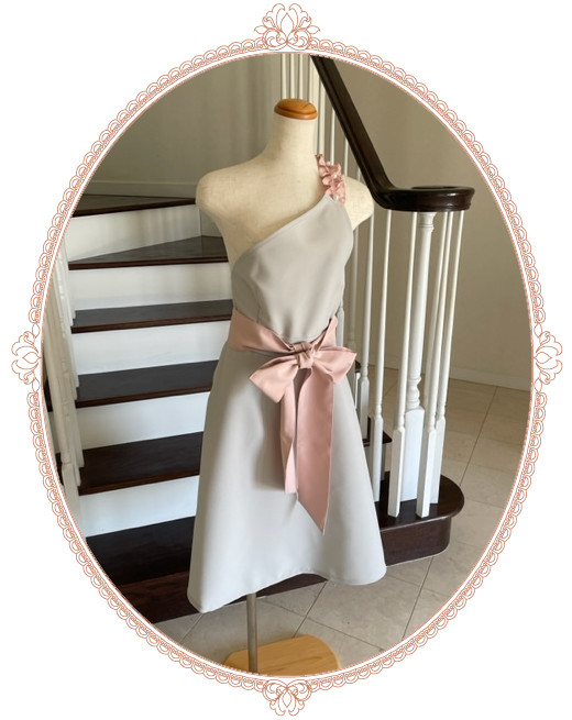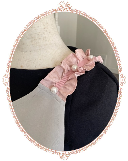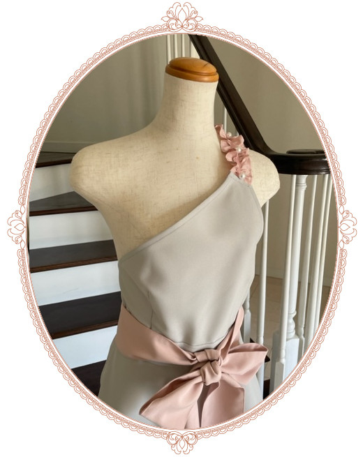 主役級の Shoulder Strapフリルを肩紐に。ギャザーの糸が切れないよう、アクセントになるグログランリボンと白く煌めくパールで仕上げた、可憐ながら主役級の肩紐です。 |