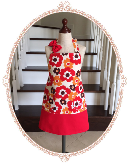 シンプルAライン肩ひもリボンエプロン レッドフラワー for kids